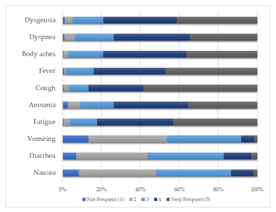 Our students identified cough, fever, and fatigue as the most frequent symptoms and nausea, vomiting, and diarrhea as the less frequent, which agrees with what we found in recent studies concerning the prevalence of symptoms [,,,,]. The amount of information available and its dissemination might justify this correct identification of symptoms. One of the relevant measures to reduce the transmission of the disease is the fast and correct identification of cases, where the recognition of the symptoms is crucial.