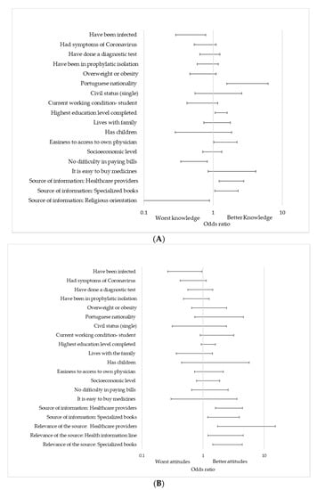 Additionally, we identified population characteristics that influenced knowledge and attitudes. The female gender relates to better knowledge and attitudes, which is consistent with previous studies [,]. Having education or practice on health also associates with better knowledge and attitudes, as expected, since these students are supposed to be prepared for health issues, with critical perception of health information, better knowledge about the diseases, medical skills, and prevention measures. Previous studies have shown that individuals with lower incomes and lower educational levels reported limited knowledge about health risks [,,]. This may justify why our students, who have difficulty paying bills and have a low level of education, have worse knowledge. A previous infection is associated with worst knowledge and attitudes. This aspect could be explained by the fact that these people might be less careful, have less access to information, and consequently are more likely to become infected. Another way to look at this point is the asymptomatic character of most patients, especially in the younger population, leading to a depreciation of the disease itself after being infected.