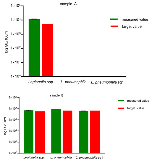 As a DNA extraction control and qPCR specificity control, sample A contained a defined concentration of 1.3 × 102 GU/100 mL L. bozemanii and sample B contained a defined concentration of 3.9 × 103 GU/100 mL L. pneumophila sg 1 (samples obtained via FEPTU, Public Health England, United Kingdom). As shown in Figure 1, sample A showed no amplification for L. pneumophila and L. pneumophila sg 1, but correct amplification for Legionella spp. Measured values for sample B showed correct amplification for all three assays, corresponding to the target value of 3.9 × 103 GU/100 mL L. pneumophila sg 1 for sample B.