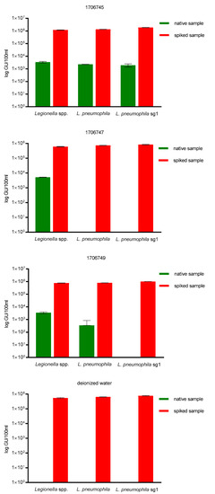 To further determine qPCR target specificity, three cooling water samples as well as sterilized, deionized water were spiked with one LENTICULE DISC containing around ~9.25 × 105 GU/100 mL (±1.45 × 105 GU/100 mL) L. pneumophila sg 1. For this purpose, the samples coming from the cooling waters were used, as they represent a difficult sample matrix, due to the potential use of biocides. Water systems that produce aerosols are especially under inspection for Legionella contamination, e.g., cooling towers, hot- and cold-water systems or spa pools, which provide comfortable temperatures for bacterial growth ranging from 20 to 45 °C, due to their heat-exchanging function and thus serve as ‘bacterial amplifiers’, which is why biocides, e.g., bromide and chlorine derivatives or quaternary ammonium compounds might be present in the sample, and could lead to inhibiton of qPCR. No inhibition of qPCR in the spiked samples was observed and the mean recovery of the spiked samples was ~9.25 × 105 GU/100 mL (±1.45 × 105 GU/100 mL) L. pneumophila sg 1 for all three qPCR assays was 100% (Figure 2).