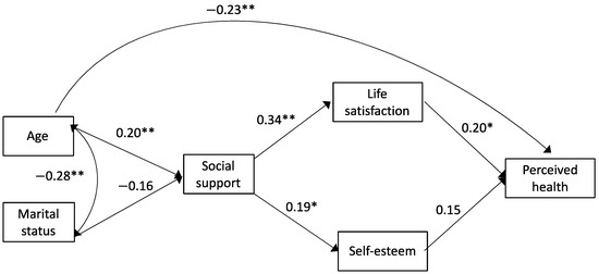 Regarding the sociodemographic variables, the results indicate that age decreases the perceived general health directly, which is consistent with a natural deterioration of health in old age, and indirectly through less social support. In the present study, it has been observed that age positively predicts the perception of social support, which in turn predicts the experiences of well-being and the general perception of the health of the elderly. However, previous literature has shown that old age reduces the social support network available [28,31,43]. Future studies need to analyze these relationships to understand better the factors that may interfere with their relationship.