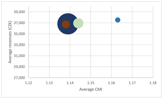 It is interesting to observe the relationship between the average patient CMI and revenues from different insurers. As an example, the following three charts (Figure 1, Figure 2 and Figure 3) show the situation in case 0606 (laparoscopy of groin, thigh, umbilical or epigastric hernia). The charts illustrate the relationship between the revenue and CMI, and at the same time the different frequency of individual insurers is shown. The individual insurers are colour-coded and if the same amount of average revenue and CMI for more insurers appears, brown is used.