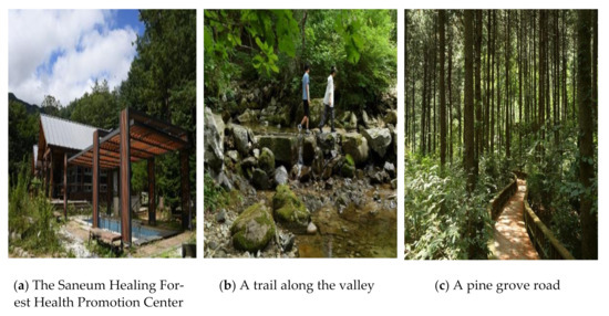 The Saneum Healing Forest is the first healing forest in Korea. It is composed of various tree species, such as pine (Pinus Densiflora Siebold & Zucc), larch (larix kaempferi (Lamb.) Carrière), and ash (fraxinus rhynchophylla), among others. The natural environment is excellent. The altitude of Saneum Healing Forest varies from about 200 to 1000 m, making it suitable for forest therapy programs using climate and exercise therapy. The valley, which has abundant water resources, is located around the Health Promotion Center. By generating anions, Healing Forest Road is known to make people feel increased immune health, mental stability, and freshness. The Saneum Healing Forest is a suitable destination for forest therapy based in sensory programs (see Figure 1).