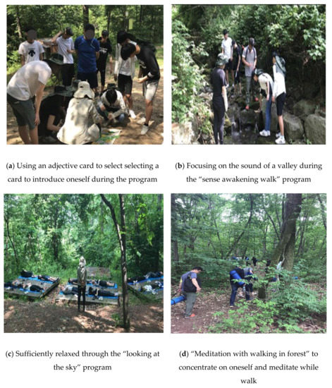 Interest in forest activity intervention is increasing day by day to help teenagers participate in effective attendance center order programs. Forest activities are known to play a positive role as a space for psychological and physical recovery. It has been reported that forest activities relieve negative emotions, such as depression and anger [40,41,42] and provide stress recovery [43,44,45]. These positive psychological effects create positive physiological effects, such as parasympathetic nerve activation [42,46,47,48,49] and stress hormone reduction [49,50]. In addition to solely experiencing the forest, research on the effectiveness of mental and physical health promotion activities is also underway through a program that is systematically organized using the sounds, scents, landscapes, and natural objects of the forest. This is also applicable to forest therapy programs for teenagers.