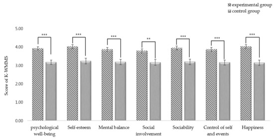 The effect of forest therapy on psychological well-being, comparing experimental and control groups, ** p < 0.01, *** p < 0.001.
