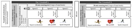 The self-selected speed was chosen by the participants during the warm-up for each treadmill and it was used then as a condition speed. Participants ran with their own shoes in both testing days to reduce biomechanics variability. The tests were separated by at least 48 h and were carried out at the same time of the day (±1 h).