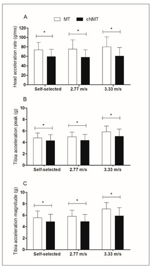 Observing the differences between speeds, significantly (p < 0.05) higher head impact acceleration, tibial peak acceleration and tibial acceleration magnitude when running at 3.33 m/s, increasing while running speed increased either on MT or cNMT. These results are in line with those observed by Sheerin et al. [], who found an increase 38% (3.8 g) in tibial acceleration from the slowest to the fastest velocities. However, only few studies have studied impact accelerations in the head and tibia during running at different speeds [].
