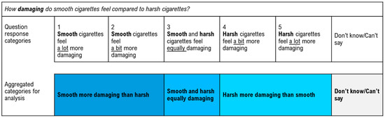 Participants were asked about their perceptions of the damage caused by cigarettes with the four different sensory experiences described above. All questions followed the same phrasing and response format, for example: “How damaging do smooth cigarettes feel compared to harsh cigarettes?”, with the response options comprising (i) “Smooth cigarettes feel a lot more damaging”, (ii) “Smooth cigarettes feel a bit more damaging”, (iii) “Smooth and harsh cigarettes feel equally damaging”, (iv) “Harsh cigarettes feel a bit more damaging”, (v) “Harsh cigarettes feel a lot more damaging” and (vi) “Don’t know/can’t say”. Responses were then collapsed into four categories: the first category “smooth more damaging than harsh” comprised the responses (i) “smooth cigarettes feel a lot more damaging” and (ii) “smooth cigarettes feel a bit more damaging”; the second category comprised the response (iii) “smooth and harsh cigarettes feel equally damaging”; the third category “harsh more damaging than smooth” comprised the responses (iv) “harsh cigarettes feel a bit more damaging” and (v) “harsh cigarettes feel a lot more damaging”; and the fourth category comprised the (vi) “don’t know/can’t say” responses (see Figure 2).