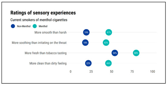 In addition to the effects of marketing, these misperceptions may also arise from the impact that taste and other sensory experiences have on smokers’ perceptions of risk [14]. Since the menthol in tobacco smoke has cooling, anaesthetic and analgesic properties, it can make menthol cigarettes easier and more palatable to smoke [2,6,15,16,17]. For example, compared to non-menthol cigarettes, smokers tend to experience menthol cigarettes as smoother, more soothing on the throat, fresher tasting and having a cleaner taste [9,11,12]. Importantly, smokers may interpret these positive sensory experiences as indicating reduced risk, which may increase the likelihood they will smoke menthol cigarettes [1,2]. For example, 16% of Malaysian and 35% of Thai smokers believed that menthol cigarettes were less harmful due to their perceived smoother smoke [18]. Likewise, in the United States, between 20% and 58% of youth and young adults reported favourable beliefs about menthol’s sensory effects, particularly refreshment sensations, which were associated with increased intention to use and current use of menthol cigarettes [12]. Taken together, the literature suggests that smokers may develop misperceptions about the risks of smoking menthol cigarettes due to the distinct and favourable physiological and sensory effects of menthol [16].