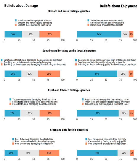 For the present series of analyses, our primary interest was in responses where the negative sensory experience was perceived as more damaging (e.g., “harsh more damaging than smooth”), which we interpreted as indicating that the positive sensory experience was perceived as less damaging (e.g., if harsh is more damaging than smooth, then smooth is less damaging than harsh). Using this approach, we were able to indirectly assess whether smokers hold misperceptions about the harmfulness of cigarettes that produce that sensory experience, without requiring them to directly state that some types of cigarettes are less damaging than others. We used the terms “feel” and “damaging” in these questions to obtain a more sensory or experiential measure of smokers’ perceptions of different cigarettes’ relative harmfulness, rather than a more cognitive measure such as “How harmful are smooth cigarettes compared to harsh cigarettes?”. Preliminary work conducted for this project—which included exploratory focus groups with 121 smokers and cognitive testing of questionnaire items with a convenience sample of 18 smokers—revealed that these smokers: (i) frequently used the term “damage” when discussing the relative harmfulness of different tobacco products; and (ii) understood the term “damage” to cover both short-term and long-term harms. However, we also note that the word “damage” may have greater resonance for Australian smokers than for smokers in other countries, given its use in the landmark National Tobacco Campaign that aired in Australia between 1997 and 2001 and prominently featured the tagline “Every Cigarette is Doing You Damage” [33].