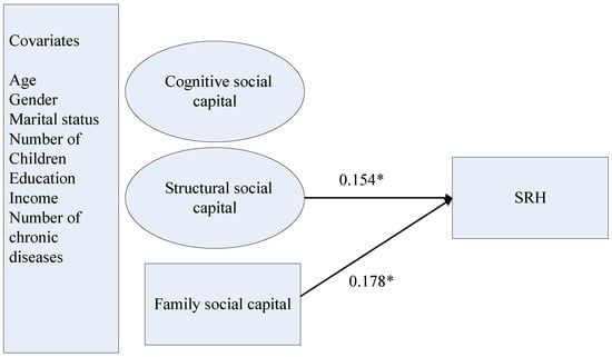 The structural model of family and community social capital, and SRH. Notes: We reported standardized coefficients in this figure. * p < 0.05 (two-tailed); SRH = self-rated health; cognitive and structural dimensions of social capital are community-based.