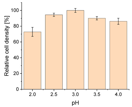 In our studies, highest cell densities were reached at pH 3.0 (Figure 1). Upon reducing the pH to 2.5 and 2.0, the cell density decreased by 9% and 27%, respectively. Increasing the pH to 3.5 and 4.0 resulted in a reduction of cell density by 13% and 14%, respectively.