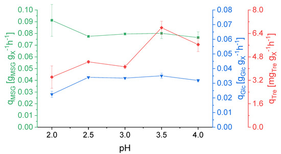 Specific uptake rates for L-glutamate (qMSG) and D-glucose (qGlc) and specific production rate of trehalose (qTre) in dependence of the pH value. Error bars indicate the difference between the various sampling points after reaching steady state in the continuous cultivation.