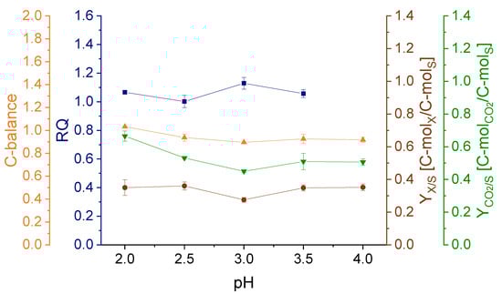 The C-balance of all cultivations closed at 1.0 ± 0.1. Also, RQ and biomass yield remained constant throughout all investigated pH values (Figure 3). Solely the CO2 yield increased at pH 2.0 compared to the other pH conditions.