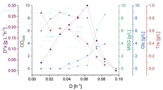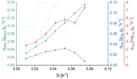 Figure 5 shows the difference between the uptake rates of D-glucose and L-glutamate. While qMSG increased with the applied dilution rate, qGlc reached its peak at 0.053 h−1. Then qGlc decreased, indicating that the metabolic capacity had been exhausted for this substrate. The specific trehalose production was increasing in response to increasing dilution rates. This is a further indication for the role of trehalose production as part of a stress response [23]. Rising dilution rates put the cell under stress due to the growth rate approaching µmax and the organism is gradually approaching its maximal metabolic capacity [24,25].