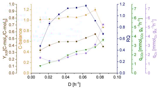 The course of the RQ values mirrored the qGlc trend in relation to the different applied dilution rates (Figure 6). The highest RQ of 1.18 was determined at D = 0.064 h−1 and the lowest at D = 0.010 h−1. These decreased RQ values at the lower and higher dilution rates, indicate a lower CO2 production in relation to the O2 consumption. Since qO2 varies more greatly with the dilution rates than qCO2, the main reason for the shifted RQ values is a change in the specific oxygen uptake rate, qO2. A less efficient oxygen utilization in the respiratory chain as a result of the dilution rate is a possible explanation for the increasing demand for oxygen. The C-balance was around 1.0 until a dilution rate of 0.074 h−1. The over- and undershooting of the C-balance at dilution rates of 0.074 h−1 and higher can be interpreted as a sign for the culture reaching a non-steady state and approaching the point of washout.