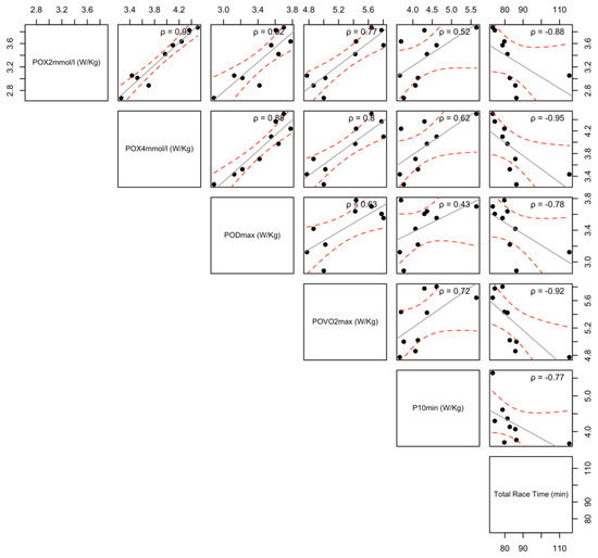 Junior mountain bike competitions have a lap length of 4–6 km and an average climbing altitude of about 500–1000 m [3], which demands a significant contribution of aerobic metabolism to fulfil the energy requirements [2]. In fact, maximal and submaximal indices of aerobic capacity, such as VO2max and peak power output at the lactate threshold, have been able to explain up to 80% of the variance in off-road cycling performance [7,8]. In the present study, large correlations (ρ = −0.67 to −0.95) were found between physiological markers of aerobic fitness and cross-country cycling performance (Figure 1), as was observed in other studies involving competitive and top-level cross-country cyclists [1,8,12,13]. In accordance with previous reports, our results suggest that the relationship between physiological parameters derived from power profile tests and cross-country cycling performance is higher when the cycling power output is normalised to body mass. This highlights the importance of the power-to-weight ratio (W/kg) in endurance disciplines that are characterised by several climbs and descents. Taking the physiological variables that best correlated with the total race time, we performed a multiple regression analysis, aiming to predict the race performance in a UCI official competition. As a result, we found a significant regression equation that was able to explain 82% of the variance in performance from only three variables: POX4mmol/L, POX2mmol/L, and POVO2max. These findings are not trivial since single regression models have shown that VO2max can only explain 20–40% of the variance in cross-country cycling performance [7,8,15]. Thus, it seems that performance in mountain biking depends not on single but rather on multiple physiological features. Thus, the combination of maximal aerobic fitness variables as well as aerobic-anaerobic transition variables may represent the best ones to predict cross-country race performance, at least in young cyclists.