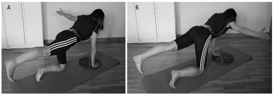 Bird-dog (BD) test. Variation of bird-dog exercise test raising the left (A) and (B) right arm to the side following the direction of the OctoBalance® line.
