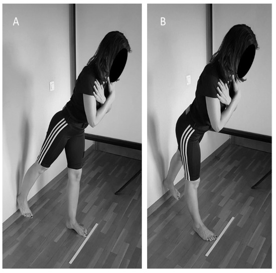 Partial range single leg deadlift test with the right heel (A) and the left heel (B) touching the wall.