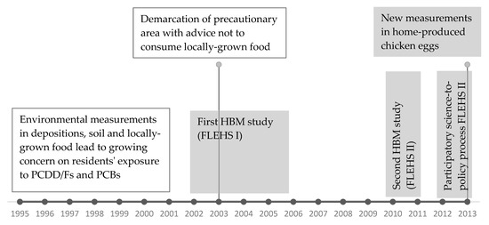 This section describes the methodology used in both FLEHS HBM studies in the region of Menen and in the study on POPs in home-produced chicken eggs. In this article, we reconstruct the sequence of study results on POPs in the region of Menen that shaped decision making and public perception and finally resulted in tailored dietary recommendations on safe consumption of home-produced chicken eggs. The time-flow of these research activities is presented in Figure 1, with the activities addressed in this article in the grey boxes. The concept of the FLEHS studies and overall results have been published in separate publications. This article focusses specifically on the Menen area.