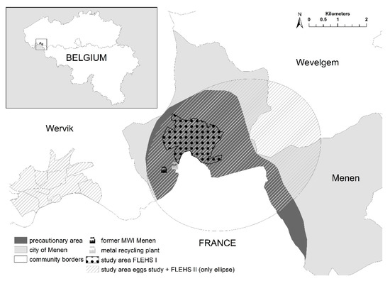 The study area of both HBM studies near the MWI of Menen was delineated based on modelled geographic emission distribution using a bi-Gaussian plume model (Immission Frequency Distribution Model, IFDM) [17]. In the FLEHS I study (sampling period between October 2002–February 2004 (newborns), October 2002–July 2004 (adolescents) and September 2004–June 2005 (adults)), the study area was restricted to residential areas close to the industrial activities (dotted area in Figure 2). The study area was expanded in the FLEHS II study (sampling period May 2010–February 2011) to include the Flemish territory inside an elliptical area (ellipse in Figure 2, longest diameter is 6.3 km) with the ICS as one of the focal points and orientation according to the dominant wind direction (excluding French territory for administrative reasons). The expansion was based on environmental data (emission inventory, plume calculations, deposition data, measurements in soil, groundwater, sediments, eggs, vegetables and milk) on the presence of additional and smaller industrial sources outside the ICS and on information received from local stakeholders. Home-produced chicken eggs were collected in an expanded study area to meet the requests of local stakeholders. In addition to the elliptical area, a residential area in the neighboring community (Wervik, Figure 2) was included, where another small metal recycling company was situated. The precautionary area in which the local authorities have discouraged consumption of home-produced food since 2003 is also shown in Figure 2 (dark grey).