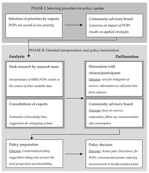 Overview of the successive steps in the policy uptake of the FLEHS II human biomonitoring results in the region of Menen. POPs: persistent organic pollutants.