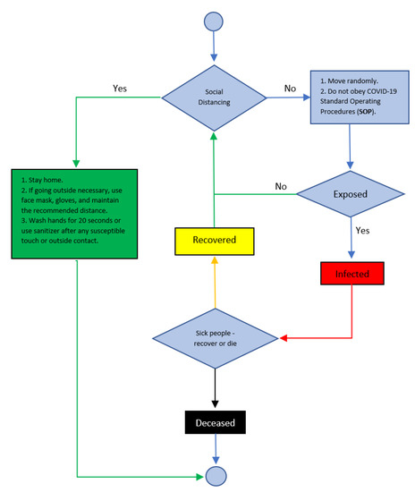 Figure 3): social distancing or no social distancing. A person moves randomly in the model and encounters another person. If one of the two people have COVID-19, the healthy person is affected and becomes sick. In the model, agents that follow social distancing guidelines refrain from interacting with others, while those who do not follow such guidelines interact with other agents.