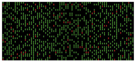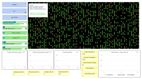 Figure 6 shows the initial visualization of the first experiment where red and green agents, respectively, represent the infected and healthy people. The disease transmission occurs through close contact between them; then, the infected cases either survive or die. Hence, the final visualization of the model renders a clear idea regarding the rates of healthy, infected, recovered, and deceased individuals at the end of the experiment.