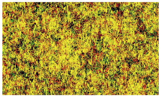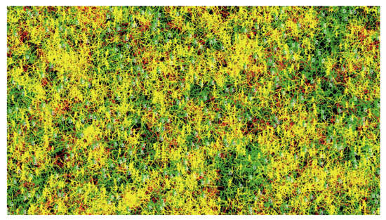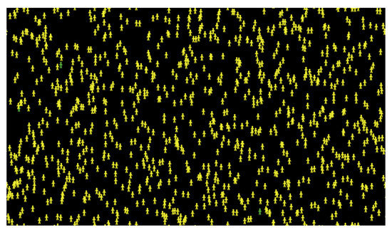 Figure 9, where the red, yellow, and green movement patterns represent the motion of infected, recovered, and healthy agents, respectively. The infected and recovered people represent a considerable part of the final visualization, while the healthy people represent a small part of motion patterns.