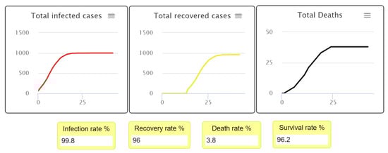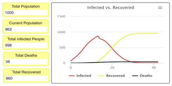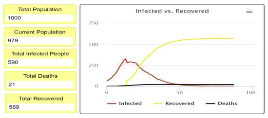 Figure 6); however, the final population number differs in each experiment in terms of the number of infected individuals, recovered individuals, and deaths in the population. This can be observed visually in the simulation output.
