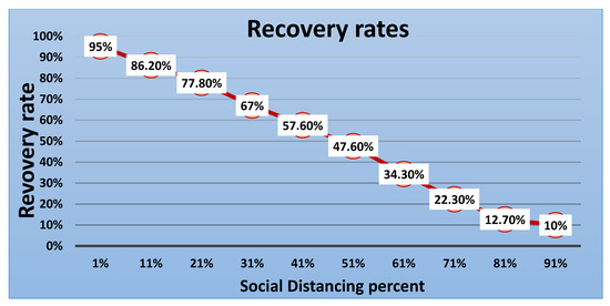 Recovery rate (recovered/total population) versus percentage of social distancing.