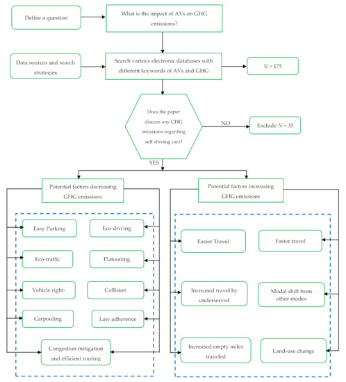 According to the United Nations Framework on Climate Change Convention, the transportation sector was responsible for 27% of US greenhouse gas (GHG) emissions in 2010 [1]. GHGs are one of the leading causes of the greenhouse effect worldwide [2]. They serve as artificial heat-trapping agents within the earth’s atmosphere. From the perspective of road transportation, fuel sources such as diesel, natural gas, and gasoline produce different GHGs in the form of byproducts. Gaseous emissions resulting from burning these energy sources include methane (CH4), carbon dioxide (CO2) and nitrous oxide (N2O), which can last in the planet’s atmosphere for several decades, causing continuous global warming [3]. These unregulated GHGs emissions disturb the natural gas cycles governing the planet and pose a significant threat to various flora and fauna types [4]. In European countries, the transport sector was responsible for 30.5% of GHG emissions and 12% contribution of GHG emissions from road transport in 2014 [5]. Another study conducted in China by Liu et al. predicted that the transport sector alone would account for 84.7% GHG emission by the year 2040 [6]. Rising concerns about the negative environmental externalities of road transportation activity and development have urged governments worldwide to assess transportation projects’ environmental impacts before implementation. The modern automobile industry trend is to move towards the development of autonomous cars [7]. Multiple considerations are driving this change, including but not limited to improved safety, greater productivity, less fuel consumption and reduced traffic congestion [8,9]. Autonomous vehicles (AVs), also known as driverless or self-driving vehicles, are those vehicles that can operate without driver control the steering, accelerate or brake; the automation ranges from 0: no automation to 5: fully automated [10].
