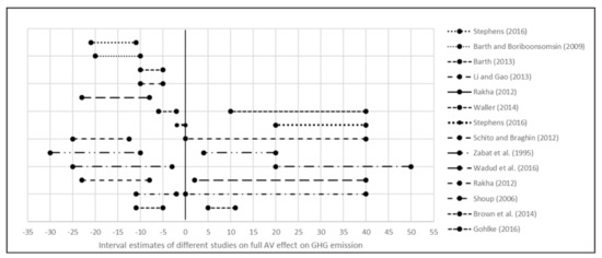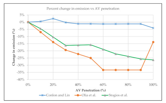 Another study by Conlon and Lin attempted to quantify the changes in CO2 emission as the AVs are gradually penetrated into a congested urban road network [82]. SUMO traffic microsimulation and Newton-based greenhouse gas model (NGM) emission model were integrated to estimate the emission for different AV penetration, ranging from 0% to 100% into the network with an interval of 10%. At an AV penetration rate lower than 30%, the total CO2 emission had increased from the baseline of 0% AVs. The increase of total emission is explained by the difficulty in the interaction between human-driven vehicles (HDVs) and AVs. As the AVs penetration rate gradually increased, the study network started to realize the benefit of AVs in traffic operation, travel speed, and emission reduction. However, the emission reduction remained plateaued between a wide range of 40% to 90% AV penetration. Finally, at full AV penetration with no heterogeneity, the network was found to yield a maximum reduction of CO2 emission of 4.08% from the base condition. The changes in emission at different AV penetration levels from different studies could be compared for better understanding (Figure 2). Existing literature in this regard suggests that noticeable emission benefits of AVs at the network level can be achieved at penetration rates ranging between 30% and 50%.