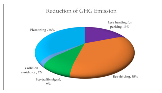 Human error accounts for more than 90% of accidents [44,45]. Collision avoidance systems in AVs are designed to provide necessary information ahead of time to the vehicle by means of well-designed vehicle mount sensors to avoid collisions. The sensors track nearby vehicles and objects to warn the system of preemptive maneuvers. In addition to the obvious individual advantages of accident avoidance, the system provides collective fuel-saving and environmental benefits by eliminating the chance of traffic congestion that might have arisen at a vehicle crash scene. According to Schrank et al., nationwide, 1.9% of GHG emission by the light duty vehicle (LDV) fleet was produced, due to the traffic congestion created at the accident spot [46]. Najm et al. integrated forward collision warning and adaptive cruise control functions to develop the ACAS for LDV applications [47]. The development of ACAS was based on an operational field test of 10 vehicle fleets driven by 66 drivers among diverse age and gender groups. The ACAS system has the potential to prevent about 10% of all rear-end crashes, which is expected to bring some indirect emission benefits. The collision avoidance attribute of both partial and full automation will reduce the GHG emissions, by preventing and minimizing jams and traffic congestion causing traffic accidents.
