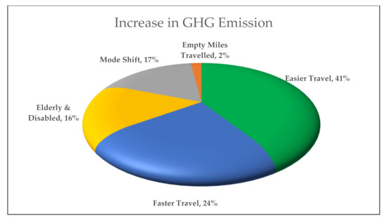 Although access to mobility services to the disabled and people at dotage rendered by the AVs seems beneficial for society, it is likely to increase overall VMT. Due to the lack of adequate data on why some population groups travel less than others, it is difficult to forecast future travel patterns of those who are currently underserved. MacKenzie et al. observed from the 2014 National Household Travel Survey data that VMT for adults over 62 years old is much lower than the 42 years old group [58]. Fully automated vehicles could fulfill this travel demand. They estimated that increased travel could raise emissions by 2–10%. Harper et al. assumed that non-drivers would travel as much as drivers in each age group aged between 19–64; drivers with medical conditions are also expected to have similar travel patterns as drivers without medical conditions within each age group [70]. Dividing the sample population into three distinct groups of non-drivers 19 and older, elderly drivers without a medical condition, and drivers 19 and older with a medical condition, it was estimated that the underserved could increase emissions up to 12% by using fully automated vehicles. Examining data from the 2009 NHTS and the 2003 Bureau of Transportation Statistics publication “Freedom to Travel,” Brown et al. estimated a 40% increase in GHG emission, If all age segments traveled close to the top decile in each segment [35]. The fact that AVs can be used by non-drivers, people without driving licenses or people with special needs will increase the road user population and hence the daily number of vehicle trips. However, although it may have several positive prospects, GHGs are expected to increase.