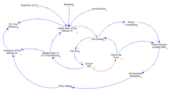 A CLD is developed based on the literature to depict the interactions of different root causes and variables with the GHG emissions from AVs (Figure 6). The CLD starts with the gradual penetration or increased market share of AVs within the transportation system. This system dynamic model assumes that both the non-AVs and AVs use fossil fuel for power generation. Since the AVs are fuel-efficient, there is a substantial chance that the demand for AVs increases, with all its benefits in terms of traffic safety, operation, and management. However, since the AVs are expected to offer several benefits to the transport system, the introductory retail price of it might be some fold higher than the conventional non-AVs. A higher retail price of AV will impart a negative effect on AV’s market share.