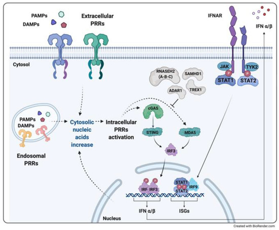 This defense strategy, however, can represent a double-edged weapon: cytoplasmic accumulation of nucleic acids, whether derived from physically or chemically-induced cellular injury or from pathogen infections, can result in an aberrant inflammatory response. This response can be amplified in the presence of defective nucleic acid disposal machinery, for example, due to deficiency in cellular nucleases. A sustained IFN-mediated inflammation eventually increases dendritic cell activation, plasma cell maturation, and autoantibody production, favoring the development of IFN-associated autoimmunity disorders, as in SLE, dermatomyositis, or Sjogren’s syndrome [31,32,33,34,35,36]. Type I interferonopathies have been recently described as a novel group of Mendelian disorders due to alterations in the recognition and/or disposal of nucleic acids, causing an aberrant stimulation of type I IFNs pathway and disease onset. Sharing significant aspects of the pathogenic cascade, the clinical phenotypes of monogenic, infectious, and multifactorial disorders may overlap.