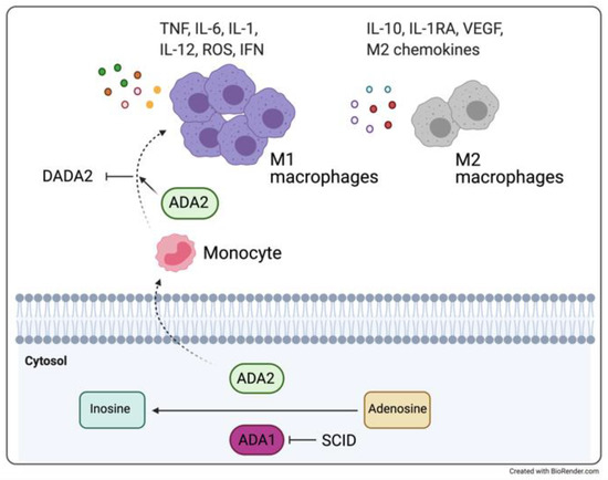 Like ADA1, ADA2 is involved in the conversion of adenosine into inosine. On one hand, a deficit of ADA1 protein is responsible for the development of severe combined immunodeficiency (SCID), on the other hand, ADA2 deficiency is associated with reduction of M2 macrophages and polarization towards M1 macrophages, with consequent increased production of proinflammatory cytokines and endothelium damage and fibrosis, and DADA2 disease. Figure adapted from [87].