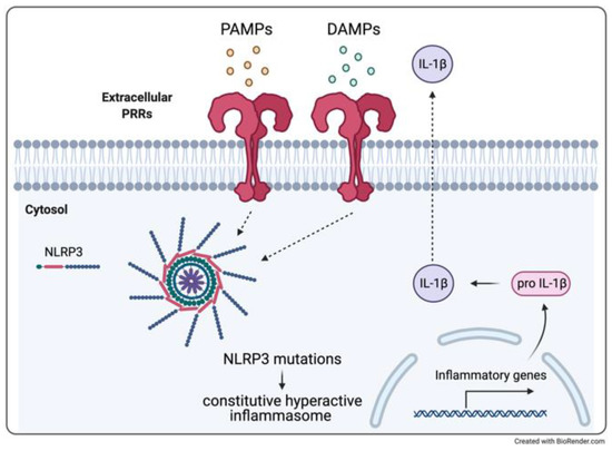 CAPS are related to a gain-of-function mutation of the NLRP3 gene coding for cryopyrin, which is fundamental for the intracellular complexes known as inflammasomes, a key component of the innate immune system (Figure 3). Defects in NLRP3 result in a constitutive hyperactive inflammasome with a dysregulated release of IL-1β, one of the major inflammatory mediators which is responsible for the systemic inflammatory “trio” of cutaneous, rheumatologic, and neurological symptoms [112,113,114,115].