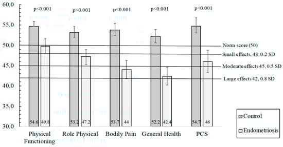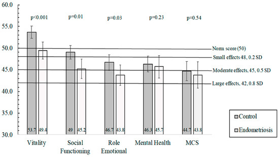 Our results were moderately consistent with previous studies that showed similar findings. In our study, HRQoL was diminished in seven of the eight health scales and the PCS in cases compared to controls. Moreover, women with endometriosis presented values of around 45 for some of the scales (physical role and bodily pain), indicating a moderate influence of the disease on those aspects of HRQoL. Likewise, cases also showed values of around 45 for a few scales of the MCS (social functioning and mental health). It is worth mentioning that the general health and emotional role scores were about 42, denoting a potentially large effect on HRQoL [15,32].