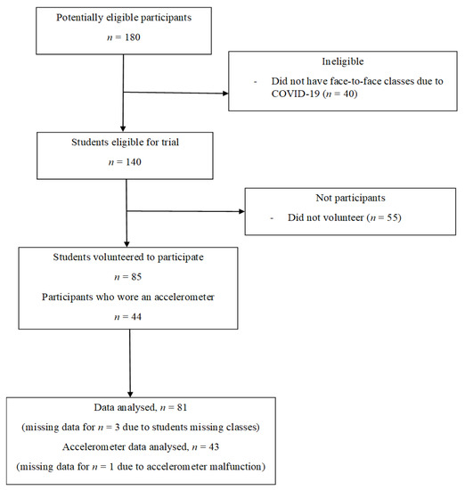 Participants were recruited between February and March 2020. Recruitment ceased after 7 groups of students (n = 140) commenced the subjects due to COVID-19 restrictions on face-to-face teaching. Eighty-five students participated in the feasibility study (61% recruitment rate) and 44 wore accelerometers (52%). Accelerometer data from 43 participants were included in the analysis as one monitor malfunctioned (Figure 2). Overall, participants had similar characteristics to the total potentially eligible population, were a mean age of 23 (SD 2) years and 69% were female (Table 1).