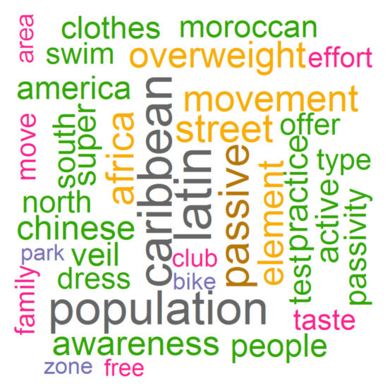 The word cloud revealed that ‘Caribbean’, ‘Latin’ and ‘population’ were the most repeated terms, followed by ‘passive’, ‘Africa’, ‘street’, ‘movement’ and ‘overweight’. See Figure 1.