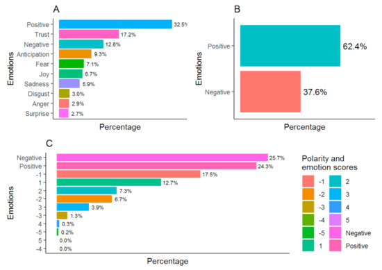 The sentiment analysis regarding the research questions showed a prevalence of positive emotions (Figure 2A,B). In contrast, according to the Afinn dictionary there is a slight predominance of negative emotions, especially scores of −1, against positive scores of 1 and 2 (Figure 2C). The associated emotions are those of trust and anticipation, followed by fear and joy (Figure 2A).