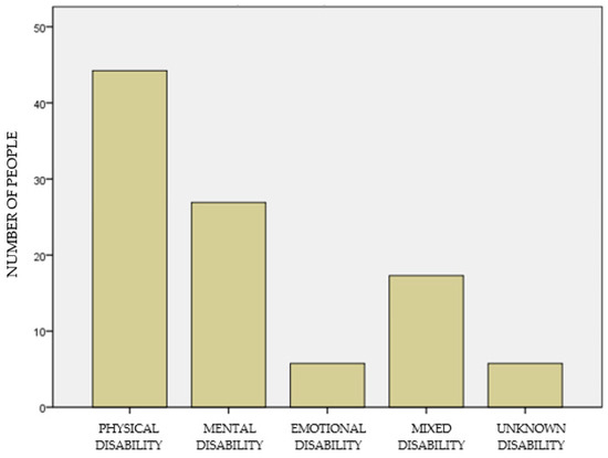 In terms of disability, most had a physical disability (N = 23; 44.2%), 14 people had mental disabilities (26.9%), 3 people emotional (5.8%), 9 mixed disability (17.3%) and 3 subjects of unknown type (5.8%) (Figure 1). Most participants had a primary caregiver (N = 41; 78.8%), whether a family member or a professional. Additionally, most people moved independently (N = 41; 78.8%) and only 11 participants needed mobility aid (21.2%). In addition to the main diagnosis of their disability, there were participants with addictions (N = 14; 26.9%), family conflicts (N = 11; 21.2%), communication difficulties (N = 8; 15.4%) and close fights (N = 3; 5.8%). Sixteen people did not present added difficulties (30.8%).