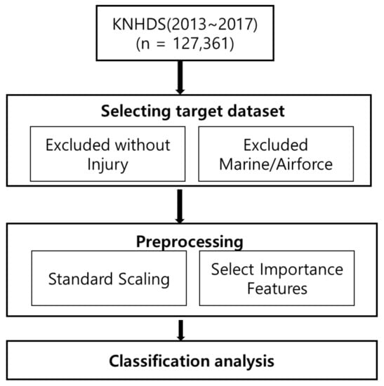 This study used five years of data from the KDCA’s National Hospital Discharge In-depth Injury Survey, which was reported between 2013 and 2017. All personally identifiable information was removed from the data before it was disclosed to the researchers. The researchers of this study requested the above data from the KDCA for research purposes and were provided the data after obtaining the agency’s approval. The survey population of the National Hospital Discharge In-Depth Survey was defined as all patients who were discharged from general hospitals that have 100 or more beds. The data excluded facilities such as long-term care hospitals, geriatric hospitals, military hospitals, and single-specialty hospitals with 100 or more beds. The hospitals were arranged based on the number of beds using a stratified two-stage cluster sampling method according to the number of hospital beds. Then, 170 hospitals were extracted using the Neyman allocation method, and 9% of the patients who had been discharged from those hospitals after receiving inpatient care were randomly selected to compose a sample []. The KDCA used in this study was panel data, and the patient’s personal information was de-identified during the collection process. Our study was approved by the Institutional Review Board of Dankook University (DKU 2021-04-019). The review board waived the requirement for informed consent due to the retrospective design of the study.