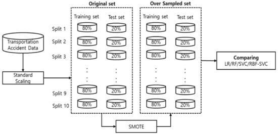Standardized scaling was performed after the motor vehicle accident data were cleaned. The performance of the prediction model is affected by the use of split training and test data. In other words, using data that have been split once can distort a model’s performance. Therefore, a model must be sufficiently verified using datasets that have been split multiple times to validate its performance []. The more data splits used, the better the model will converge according to the law of large numbers []. Accordingly, as depicted in Figure 2, this study used a dataset generated by randomly splitting the motor vehicle accident data, which were extracted from the database, a total of ten times in order to develop and verify a model.