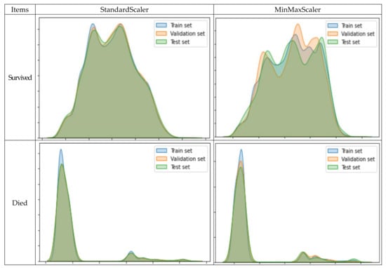 The variables in this study were standardized to minimize the bias that occurs when the variables used in the classification analysis have different units. Methods of standardization in this study included the StandardScaler method, which removes the mean and scales the data to unit variance, as well as the MinMaxScaler method, which rescales data so that all feature values are between 0 and 1. This study compared the distribution of the training, validation, and test datasets after using the two methods of standardization to standardize the data in Figure 3. As a result, it was possible to see the difference in distribution between the training, validation, and test datasets when the MinMaxScaler method was used. Thus, as the distribution of the datasets was better when the StandardScaler method had been used to standardize the data, compared to when the MinMaxScaler method had been used, this study utilized the StandardScaler method.