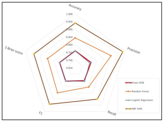 Five model evaluation metrics were used to assess the classification models used in this study. The distribution of the evaluation result values ranged from a minimum value of 0.753 to a maximum value of 0.942, indicating that the performance was above a certain level. In terms of accuracy, the models that used logistic regression and linear SVM algorithms had a low accuracy score of 0.76. The model that used the random forest algorithm had an accuracy score of 0.844, and the model that used the RBF-SVM algorithm had the highest score of 0.941. In terms of the F1 score, which is the harmonic mean of the precision and recall, the logistic regression and linear SVM models had low scores of 0.756 and 0.758, respectively. The random forest model had an F1 score of 0.851, and the RBF-SVM model had the highest score of 0.942. According to the evaluation results, the RBF-SVM model was the superior model with regard to all evaluation metrics. The random forest model performed the second best, while the evaluation result values were similar for the logistic regression and linear SVM models in Figure 4.