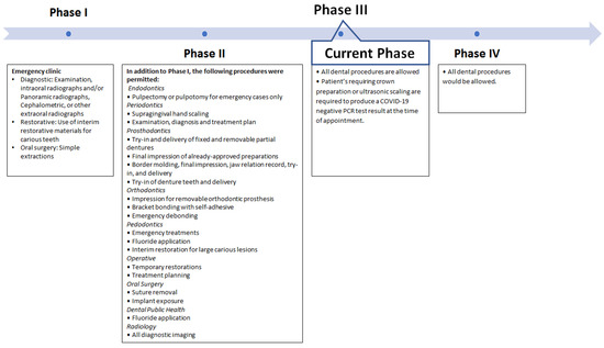 It was decided that the dental clinic would reopen in four phases. A list of the clinical procedures that were permitted in each phase is shown in Figure 1.