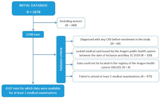 Figure 1 depicts how the study population was selected. Our analysis was limited to men, owing to the limited number of women (N = 380) in the cohort. Workers diagnosed with any CVD before inclusion in the AWHS, and those who lacked a medical card issued by the Aragón public health system between the date of inclusion and 31 May 2019, were excluded from our analysis. Eight individuals for whom data could not be located in the registry of the Aragon health system (SALUD) were also excluded.